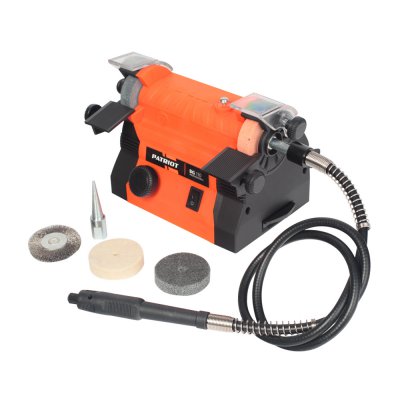 ТОЧИЛО "PATRIOT" BG 110 с гравером на гибком валу и насадками в комплекте. Малогабаритный корпус агрегата отличается простотой хранения и транспортировки. Стабильная частота вращения оснастки гарантирует высокое качество результата работы. Упоры для инструмента и прозрачные кожухи способствуют удобству и безопасности эксплуатации.