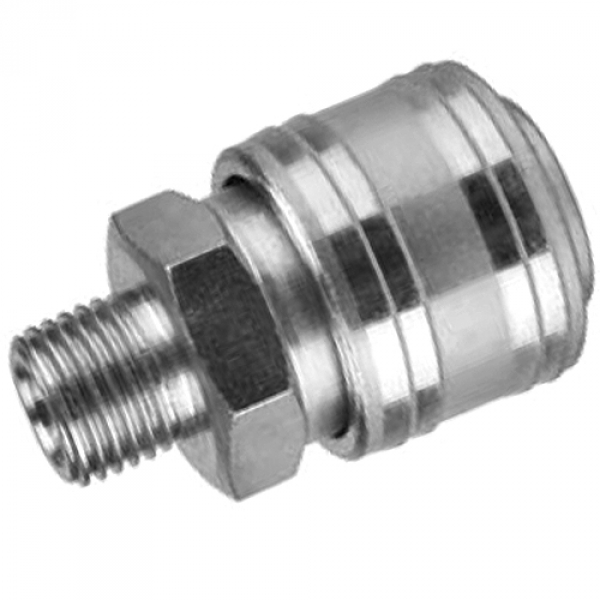 Переходник применяется для соединения различных частей пневмосистем. Наружная резьба — 1/4" папа. Внутренняя — быстросъемное соединение мама.