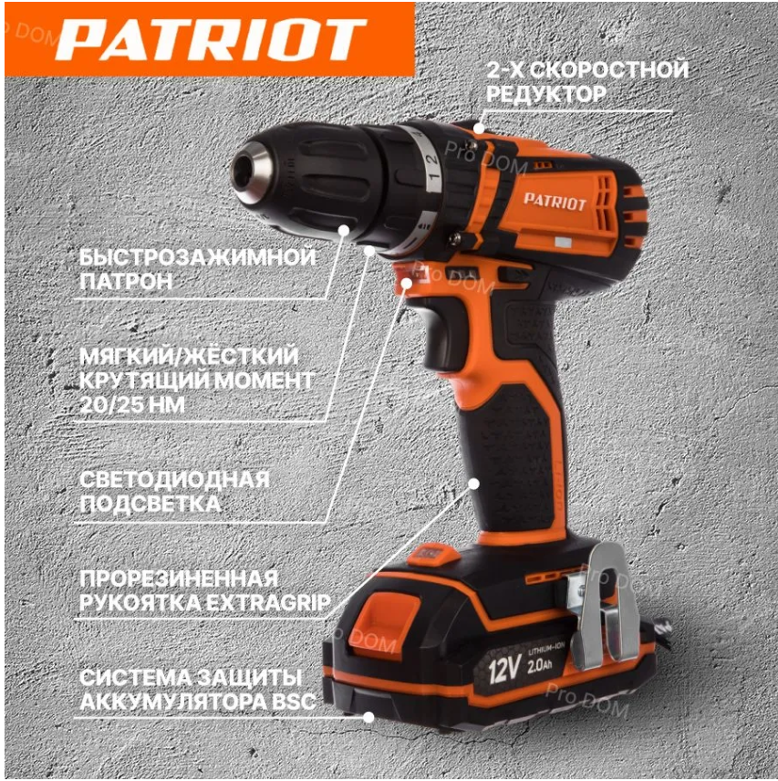 Аккумуляторная дрель-шуруповерт "PATRIOT" BR101Li /101ES 12В, 1 аккум. Li-ion, 2,0 Ah, 2 скорости