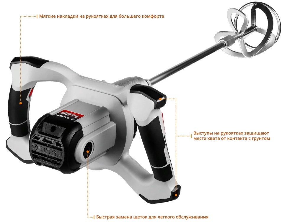 Ручной электрический миксер ЗУБР МАСТЕР МР-1400-2 прост и надежен в эксплуатации. Используется для перемешивания различных строительных составов: бетона, штукатурки, плиточных и обойных клеев, дисперсных красок и др.