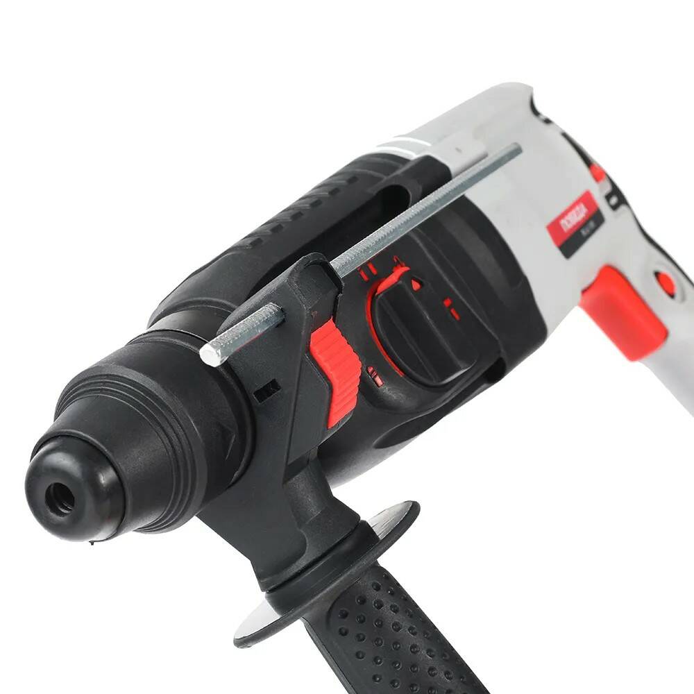 Перфоратор является инструментом среднего класса, оснащенным горизонтальным расположением двигателя. Устройство дополняется ограничителем глубины сверления и поставляется с дополнительной ручкой. Имеется удобная кнопка-блокиратор от случайного включения прибора.