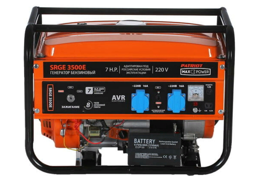 Бензиновый генератор PATRIOT Max Power SRGE 3500E обладает высокопрочным рамным корпусом с усиленной панелью управления, что является залогом его продолжительного рабочего ресурса. Данная модель отлично подходит для использования на небольших строительных площадках, в автосервисах, а также в быту. В конструкции электростанции предусмотрены 2 розетки, рассчитанные на подключение однофазных потребителей суммарной мощностью до 2500 Вт. Наличие выхода на 12 В позволяет экстренно зарядить севшие автомобильные аккумуляторы.