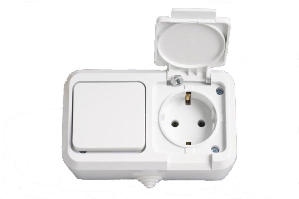 Блок Выключатель одноклавишный + Розетка открытой установки, влагозащищенный (IP44).