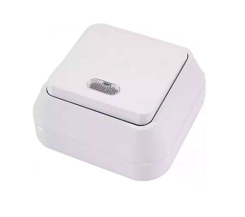 ыключатель предназначен для наружной установки. В изделии предусмотрена миниатюрная подсветка. Одноклавишную розетку можно устанавливать в помещениях, которые подвержены повышенной влажности, так как устройство обладает повышенной степенью защиты от пыли и влаги (IP 20). Для производства использовался высококачественный пластик.