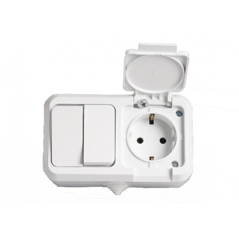 Блок Выключатель двухклавишный + Розетка открытой установки, влагозащищенный (IP44).