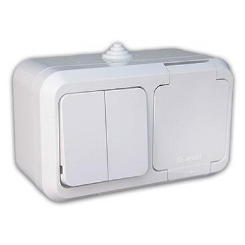 Влагозащищенный электроустановочный блок открытой проводки с двухклавишным выключателем и евророзеткой с крышкой 18351 (Makel) применяется для наружного монтажа и предназначен для управления освещением источника света в местах с повышенной влажностью (IP44).