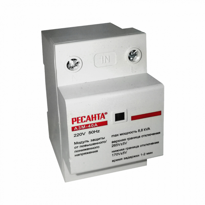 Модуль защиты от повышенного/пониженного напряжения предназначен для защитного отключения потребителей электроэнергии суммарной мощностью не более 6,6 кВА при повышении напряжения в сети электропитания переменного тока более 265 В или снижении до уровня менее 170 В. Включение происходит автоматически после установления величины напряжения в пределах указанного диапазона с задержкой 2-3 минуты. Номинальные параметры электросети: 220 В, 50 Гц.