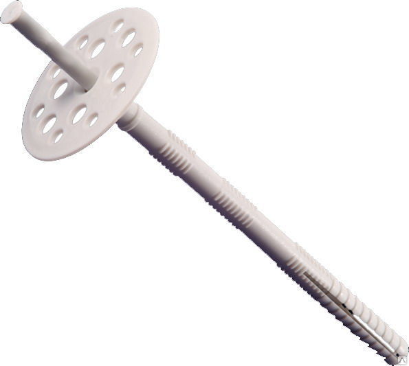 Применяется для крепления теплоизоляционных материалов к бетону, полнотелому и пустотелому кирпичу, камню, пенобетону. Представлен в виде дюбеля с двухсегментной распорной частью из ударопрочного сополимера с увеличенной прижимной шайбой диаметром 60мм и пластиковым гвоздем.