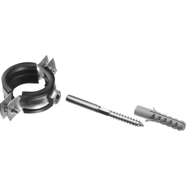 Уплотнитель из высококачественной морозостойкой резины обеспечивает идеальную шумоизоляцию.Ребро жесткости придаёт изделию дополнительную прочность.Хомуты крепятся к любым основаниям.Универсальность крепления, позволяет крепить как с помощью гайки, так и с использованием шпильки и дюбеля (входят в комплект).Цинковое покрытие защищает от коррозии и продлевает срок службы изделия.