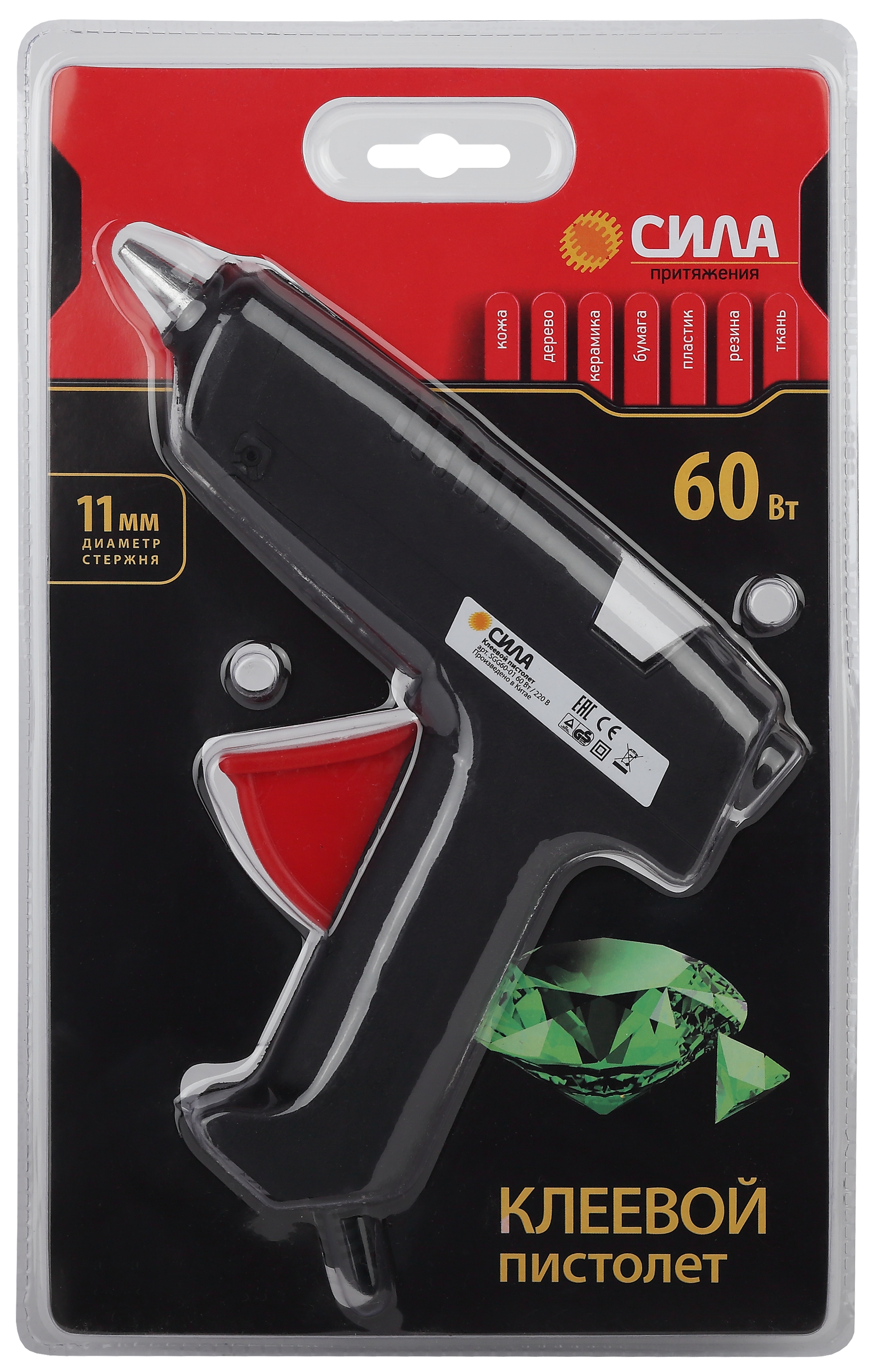 Пистолет термоклеящий "СИЛА" 60Вт 11мм (в компл.11мм *7см 2шт) (Б0046684)