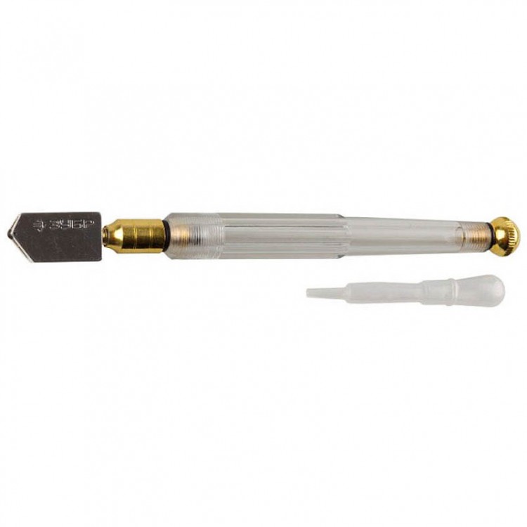 Стеклорез качественно режет даже толстое стекло. Он имеет систему автоматической подачи масла и ограничитель. Масло минимизирует трение ролика, что повышает срок службы инструмента. Пластмассовый корпус стеклореза является прозрачным, за счёт чего контролировать уровень масла проще. У данного инструмента головка подпружиненная (не поворотная).