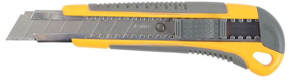 Нож применяется для разрезания картона, напольных покрытий и кожи. Оборудован сегментированным выдвижным лезвием шириной 18 мм. В корпусе, изготовленном из прочной пластмассы, расположена металлическая направляющая, что увеличивает срок эксплуатации инструмента.