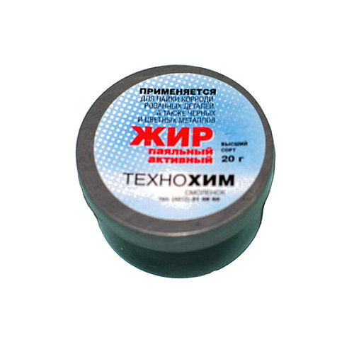 Жир активный применяется для пайки окисленных деталей из черных и цветных металлов припоями оловянно-свинцовой группы. Хорошо держится на металлических контактах, обеспечивая точное дозирование и высокую скорость нанесения на большое количество мест паек. Не требует промывки, а в случае необходимости легко удаляется изопропанолом или бензином. Состав: канифоль, стеарин.