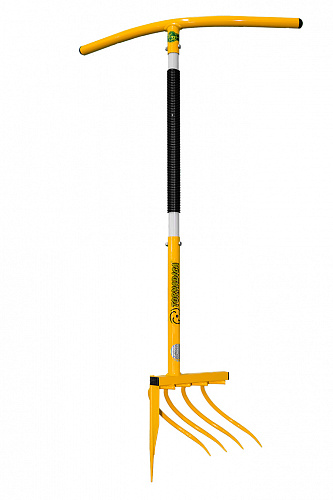 Принцип работы следующий: инструмент ставите вертикально вниз на земельный участок параллельно гряде и поворачиваете вокруг оси — вворачиваете зубья инструмента в почву под картофельный куст, выкидывая клубни наружу.