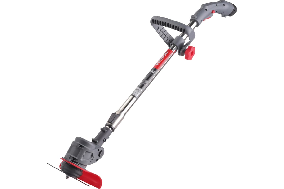 Лёгкий бытовой аккумуляторный триммер с регулируемой D-образной передней рукояткой, телескопической штангой, изменяемым углом наклона головки.