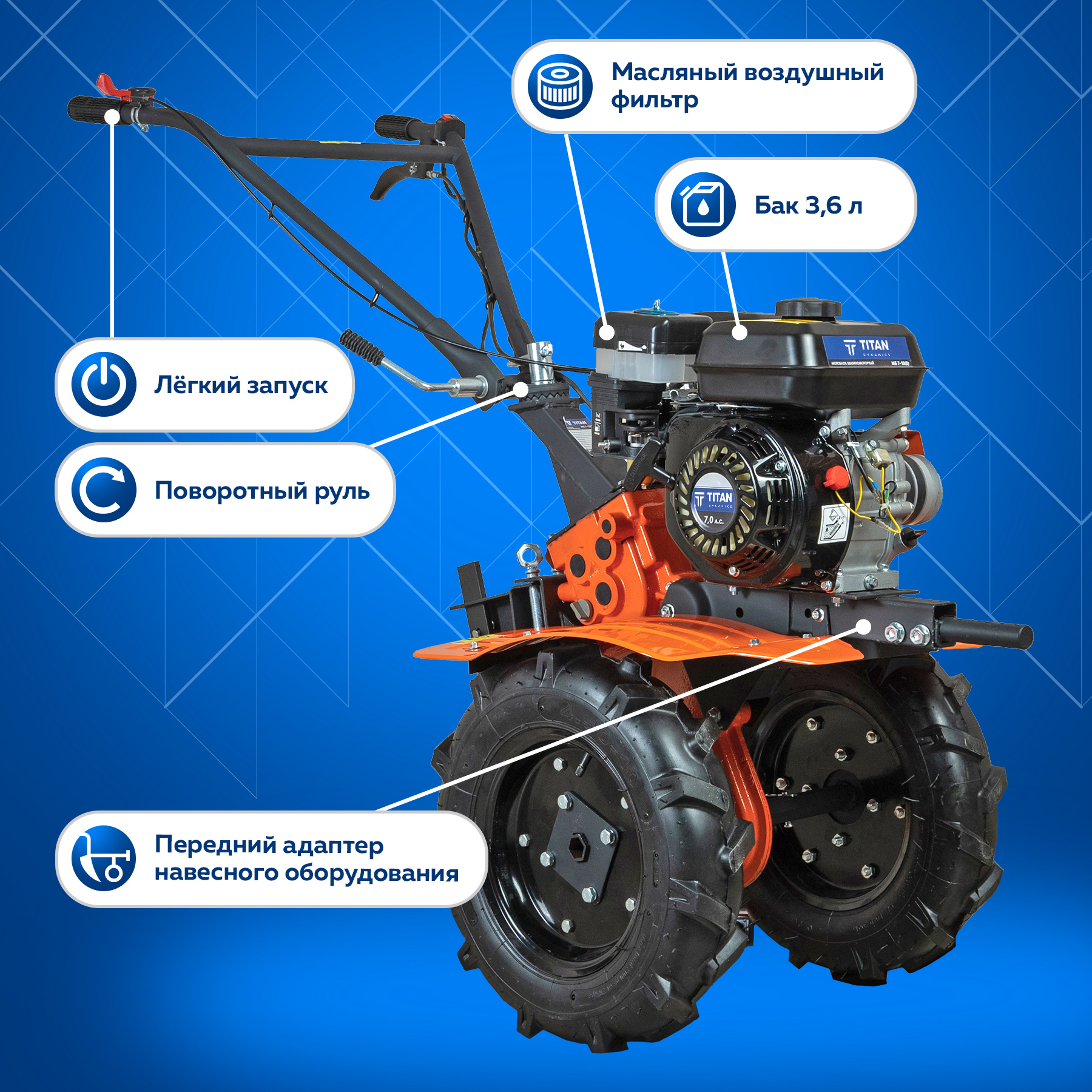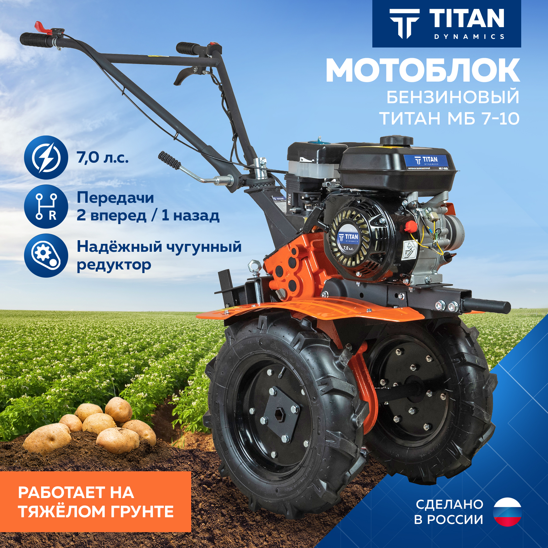 Устройство зарекомендовало себя как надежное и мощное, обладающее высокой работоспособностью и производительностью."TITAN" МБ 7-10 оснащен бензиновым четырехтактным двигателем 168F. Тип охлаждения мотора — воздушное. Мощность — 7л.с Мотоблок способен выполнять весь спектр сельхозработ: вспашка, культивация, нарезка борозд, окучивание, посадка и сбор картофеля, скашивание травы, перевозка грузов, а зимой поможет очистить участок от снега..