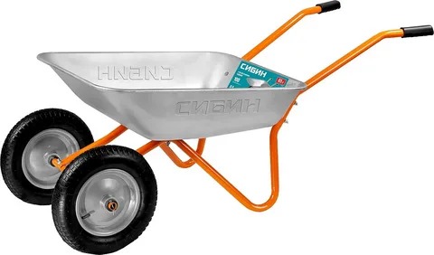 Садовая двухколесная тачка, предназначена для транспортировки грузов. Обладает хорошей устойчивостью на неровной поверхности. Грузоподъёмность составляет 100 кг. Цинковое покрытие придает кузову устойчивость перед коррозией.