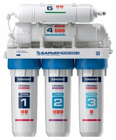Фильтр под мойку для очистки воды шестиступенчатый c технологией обратного осмоса БАРЬЕР ПРОФИ Осмо 100 М с минерализатором Н152Р01 очищает воду и насыщает её полезными ионами кальция, фтора и магния до физиологической нормы.
