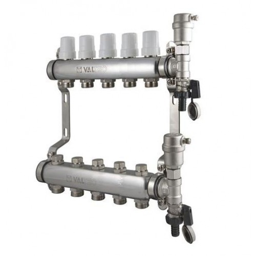 Коллекторные блоки для распределения теплоносителя по петлям теплого пола или по приборам отопления. Выходы подающего коллектора укомплектованы ручными регулировочными клапанами с расходомерами, обратного – ручными запорными клапанами, на которые можно установить электротермические сервоприводы. Каждый коллектор имеет автоматический воздухоотводчик и дренажный клапан. Материал корпуса – нержавеющая сталь AISI 304, фитинги, детали термоклапана, корпус воздухоотводчика выполнены горячим штампованием из латуни CW617N, уплотнительные кольца, золотниковые прокладки клапанов – из EPDM 70Sh. Количество выходов – от 2 до 12, рабочее давление – 8 бар, рабочая температура – 90 °С. Условный диаметр коллекторов – 1". Резьба выходов – наружная, 3/4". Присоединение циркуляционных петель осуществляется с помощью фитингов стандарта «евроконус».