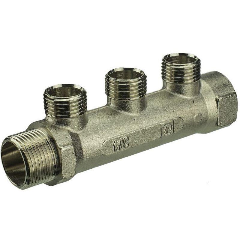 Латунный никелированный коллектор на 2, 3 или 4 выхода диаметром 3/4" с наружной резьбой, стандарт присоединения – «евроконус». Диаметр коллектора – 1", резьба – внутренняя/наружная. Рабочая температура теплоносителя – до 130 °С, давление – до 16 бар. Применяется для распределения потоков жидкостей в контурах теплого пола, радиаторного отопления, холодного и горячего водоснабжения.