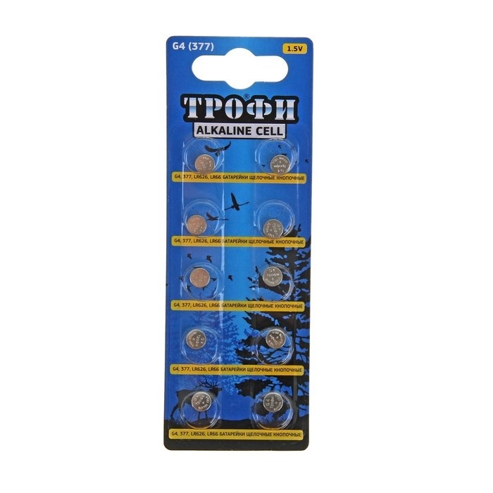 Батарейка Трофи G4 представляет собой образец отечественных элементов питания, применяющихся в небольших электронных устройствах (часах, игрушках, фототехнике и т. п.) с постоянным низким потреблением энергии. Блистер батареек Трофи G4 содержит 10 элементов питания форм-фактора G4, обладающих мощностью 1.5 В, что делает применение данных элементов возможным в небольших электронных приборах.