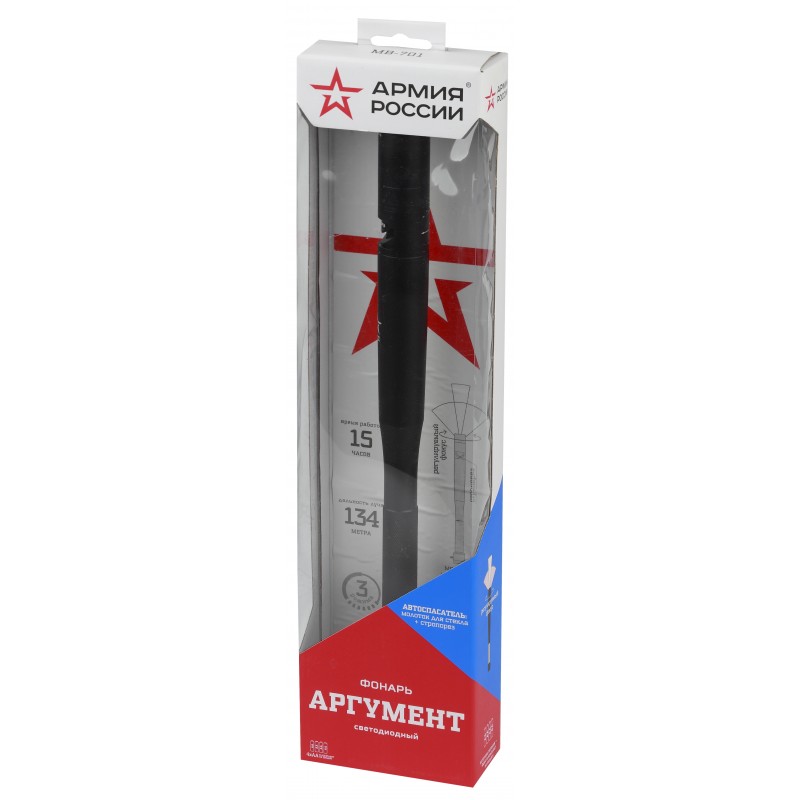 Фонарь "АРМИЯ РОССИИ" MB-701 представляет собой устройство "3 в 1", выполненное в виде биты, которое сочетает в себе фокусируемый фонарь, молоток для стекла и стропорез. Данная модель прекрасно подходит для перевозки в автомобиле и использования в нестандартный ситуациях в качестве самоспасателя.