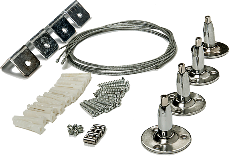 Комплект подвесов потолочный на тросах 1. Трос металлический 1 метр – 4 шт. 2. Держатель тросовый потолочный – 4 шт. 3. Дюбель пластиковый в комплекте с саморезом – 12 шт. 4. Зажим тросовый – 4 шт. 5. Заглушка с резьбой – 8 шт. 6. Уголок крепежный – 4 шт.