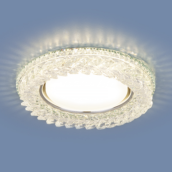 Точечный светильник со встроенной LED подсветкой 3024 GX53 CL используется для создания основного и дополнительного освещения и в качестве эффектных декоративных элементов светового дизайна. Хрустальный декор светильника преломляет свет и создает яркие и переливающиеся блики.