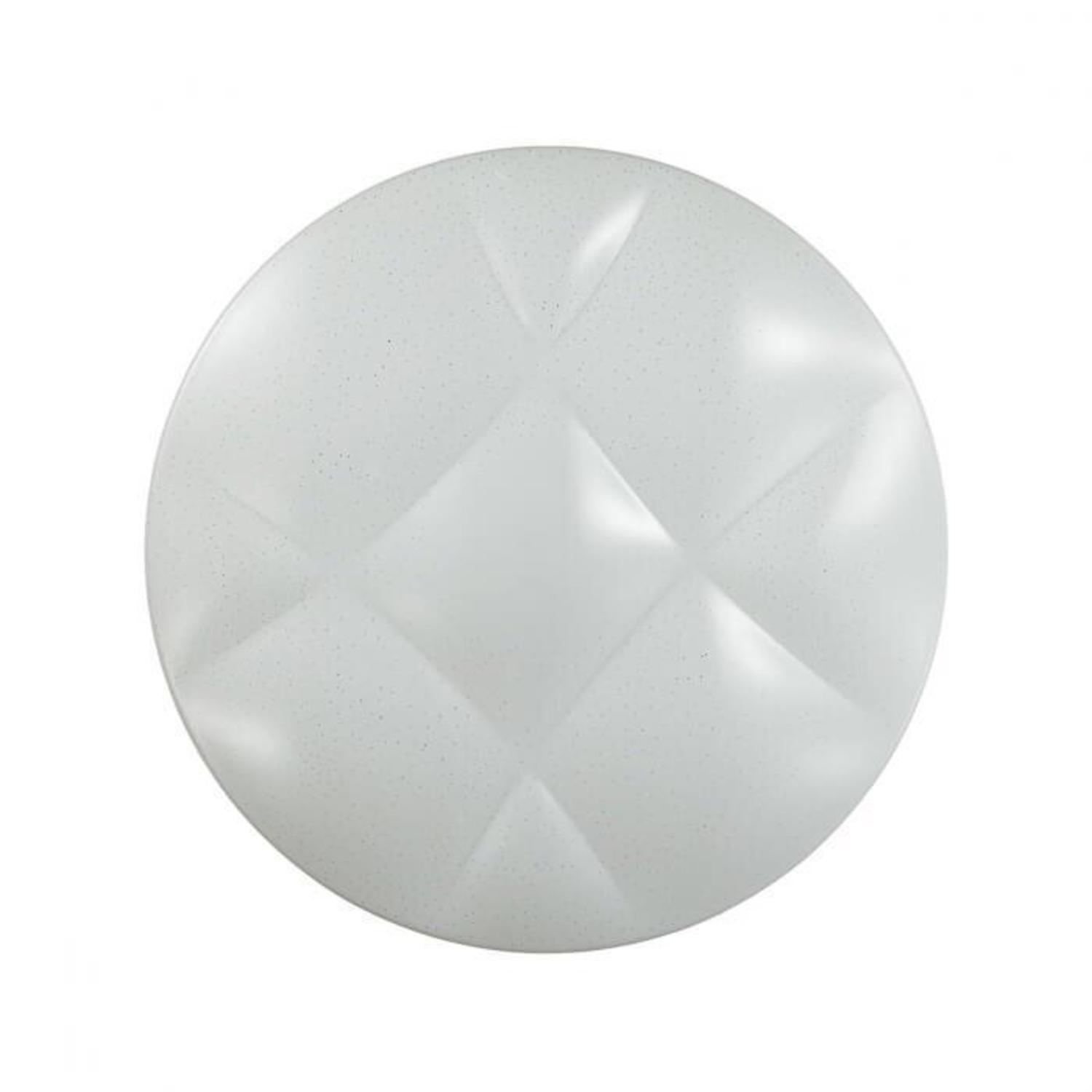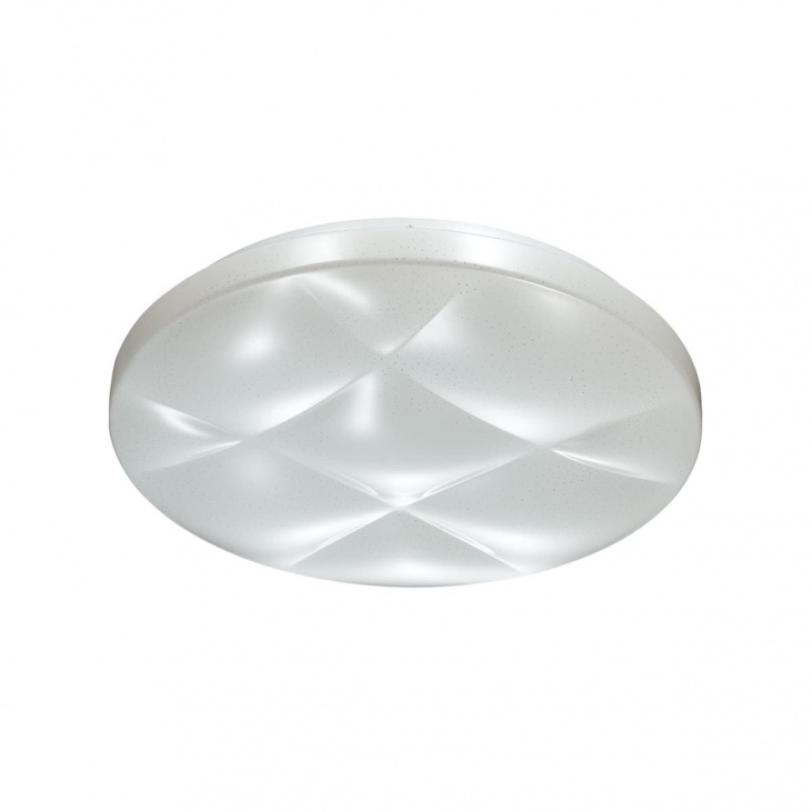 Светильник 2087/DL линии RUSTA состоит из металлического основания (базы) и пластикового рассеивателя. Материал рассеивателя - высококачественный акрил белого матового цвета, обеспечивающий светильнику равномерное рассеивание и хорошее светопропускание. Форма плафона: круглая, в виде рельефного орнамента, который декорирован прозрачными точками, придающими включенному светильнику красивый эффект "звездного мерцания" и переливания. Степень защиты IP43 позволяет использовать светильник в определенных зонах влажных помещений. В комплект входит заменяемый LED модуль с линзами, мощностью 48Вт, которая соответствует лампе накаливания 350Вт. А также пульт ДУ, с помощью которого осуществляется плавное изменение цветовой температуры 3000-6000К, изменение яркости, переход в режим переключения теплого/белого/холодного/ночного света. Светильник имеет функцию "память". Беспроводной пульт ДУ Материал: База - металл. Плафон - декорированный пластик..