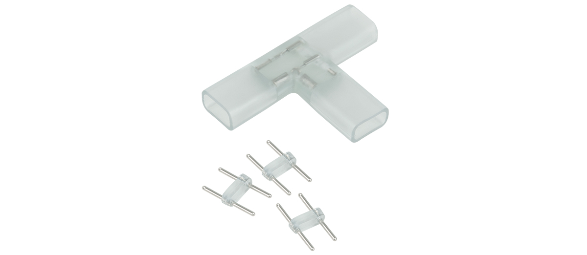 Переходник используется для соединения участков светодиодной ленты между собой. Материал переходника схож с материалом, из которого изготовлена оболочка ленты, благодаря чему он практически незаметен.